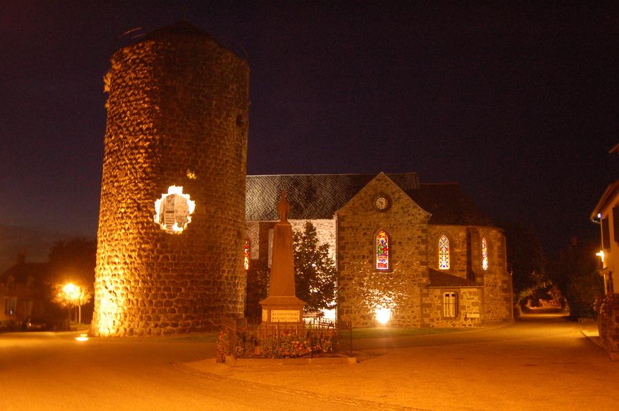 Tour donjon du XIIe, servant de clocher à l’église Saint-Julien néogothique (XIXe).